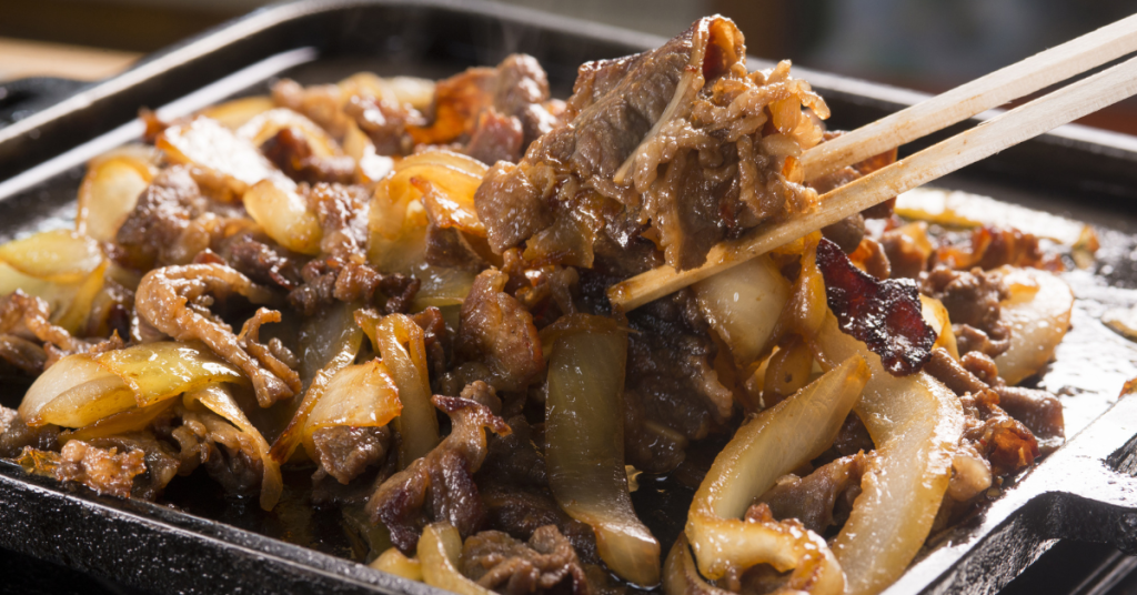 1. 十和田バラ焼き:牛バラ肉と玉ねぎの甘辛鉄板焼き